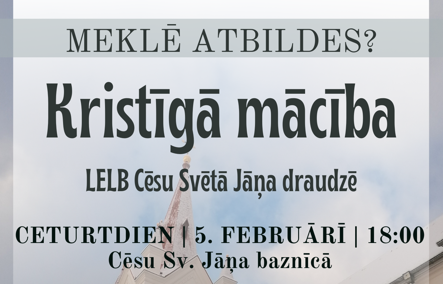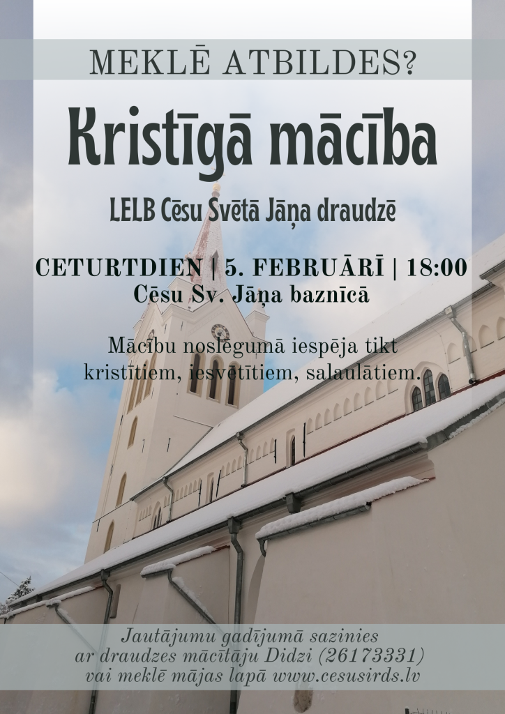 Jaunais 2026. gada ziemas/pavasara Kristīgās mācības kurss Cēsu Sv. Jāņa draudzē tiks uzsākts ceturtdien, 5. februārī plkst. 18.00 Cēsu Sv. Jāņa baznīcā.